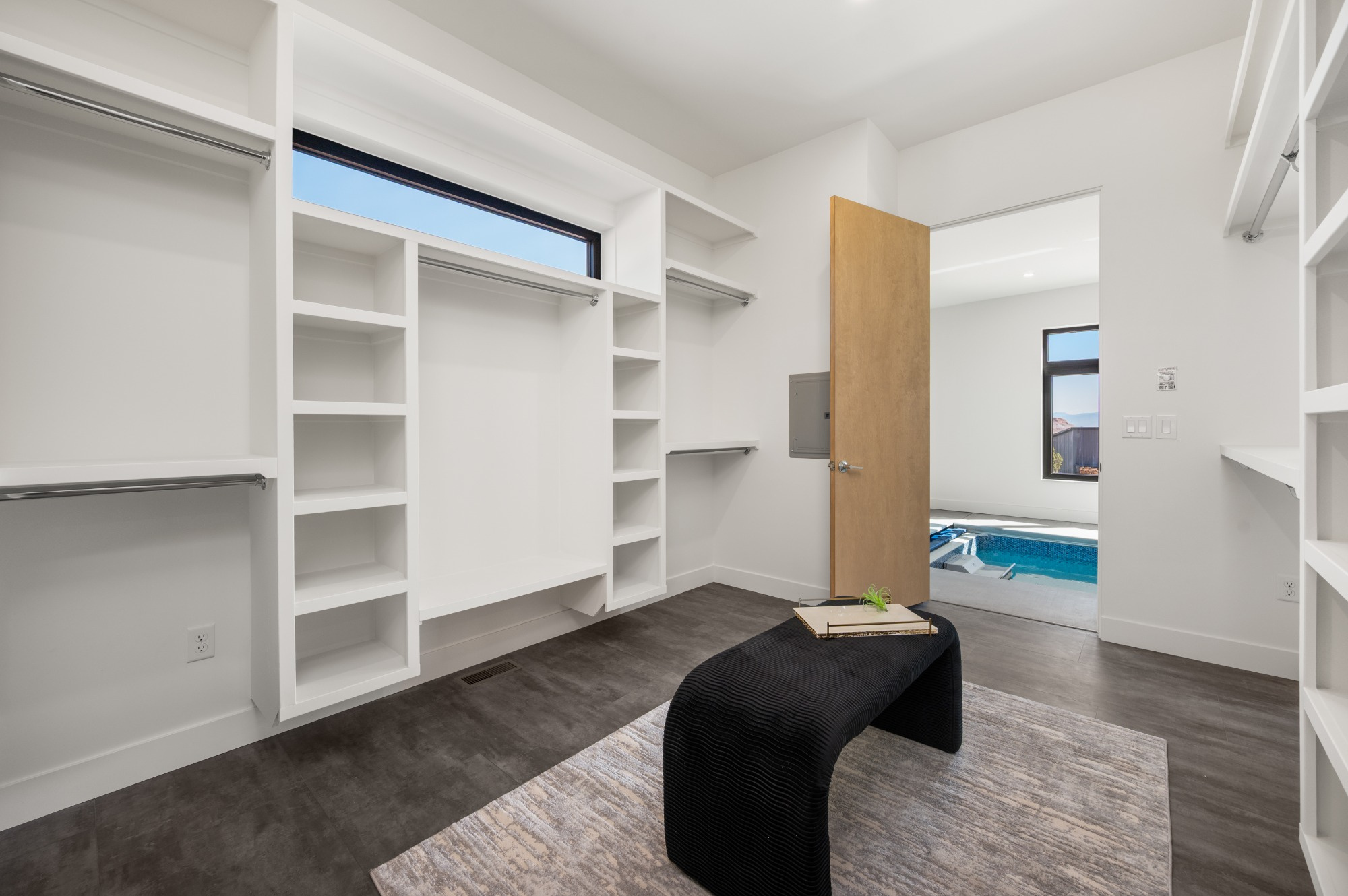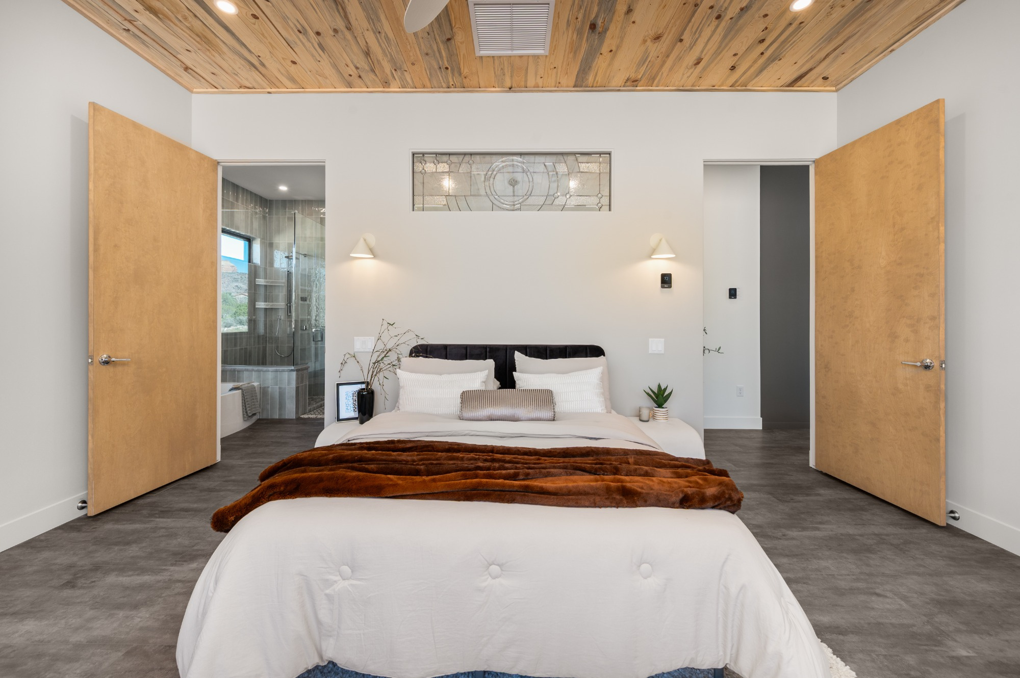 The architecture is a Modern Prairie-style design inspired by Frank Lloyd Wright, defined by expansive overhangs that temper mid-day sun while flooding interiors with natural light. Nearly every room enjoys dual or multi-directional exposure, creating a sense of connection to the surrounding landscape. Inside, the aesthetic leans toward refined Scandinavian and Japandi minimalism, with trim-less solid wood doors and a cohesive, quiet material palette.