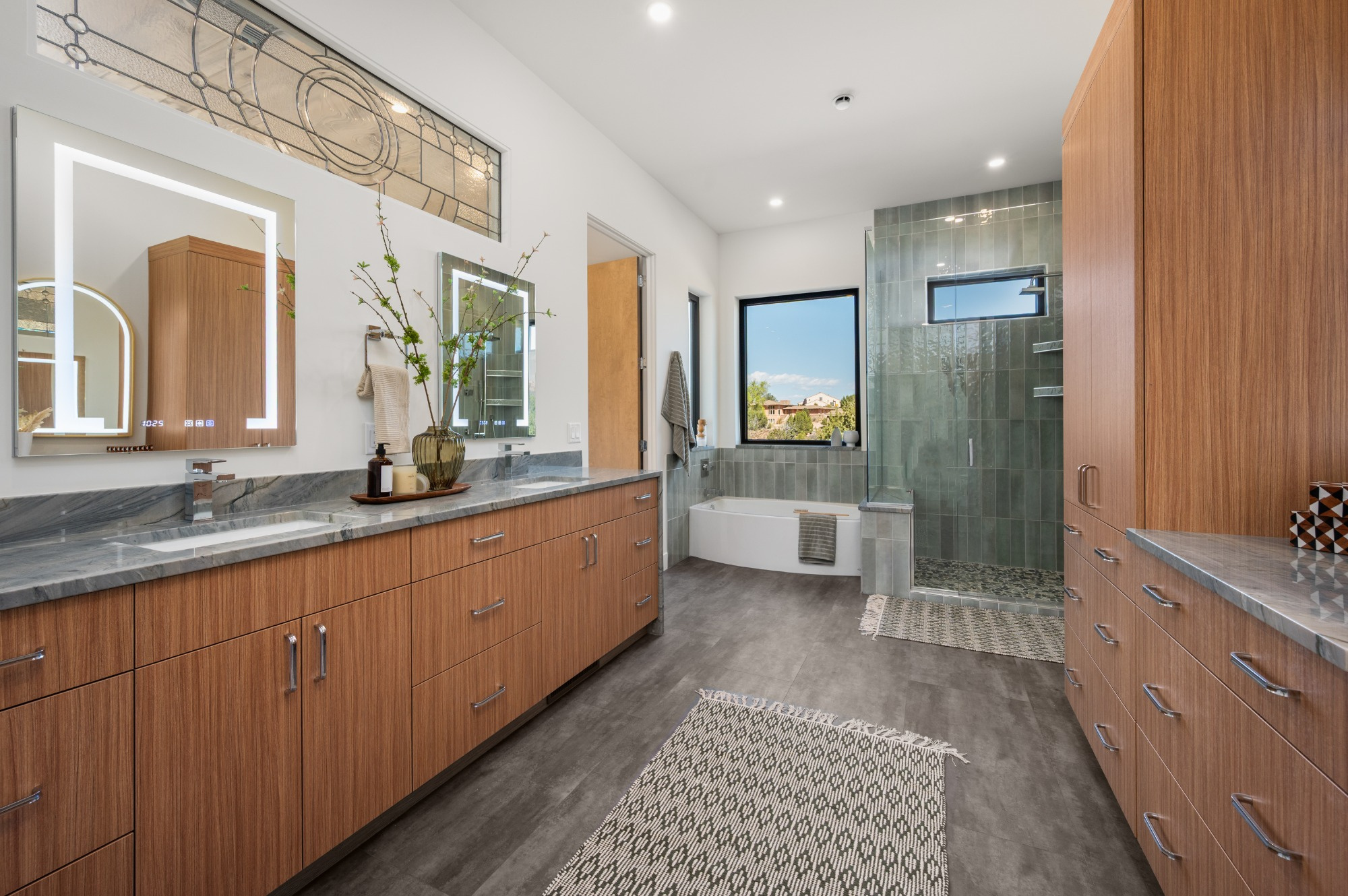 The exterior envelope was constructed with wildfire mitigation at the forefront. A sealed-envelope assembly eliminates traditional soffit vents, reducing ember intrusion. Cladding combines real stone, smooth stucco, and Class-A fire-rated wood-look materials. Cement-board soffits, fire-rated deck assemblies, heavy-gauge standing steel accents, and top-tier composite slate-like roofing provide exceptional fire, hail, and wind resistance. Even the skylight is a wildfire-rated unit sourced specifically for this project.