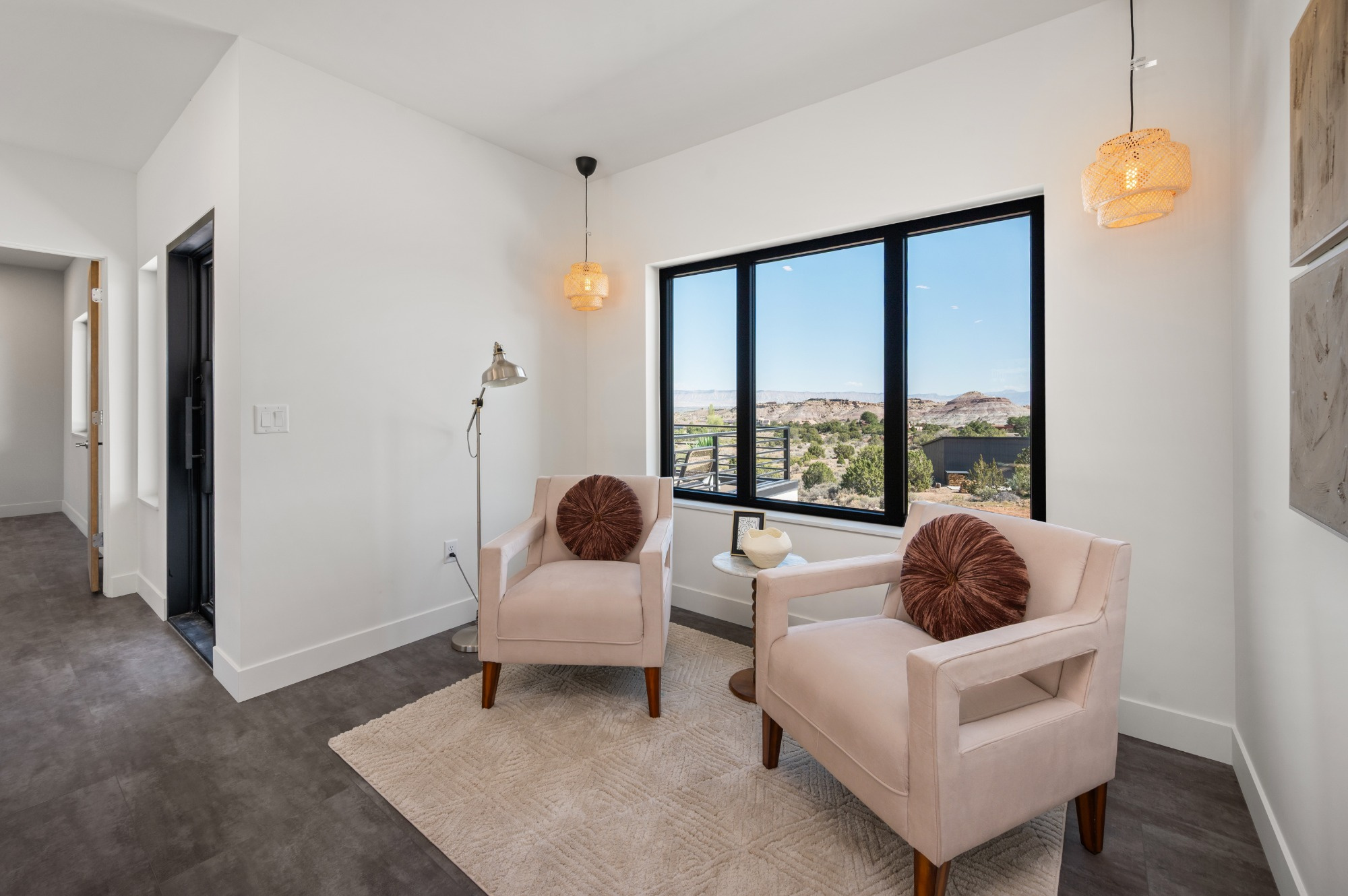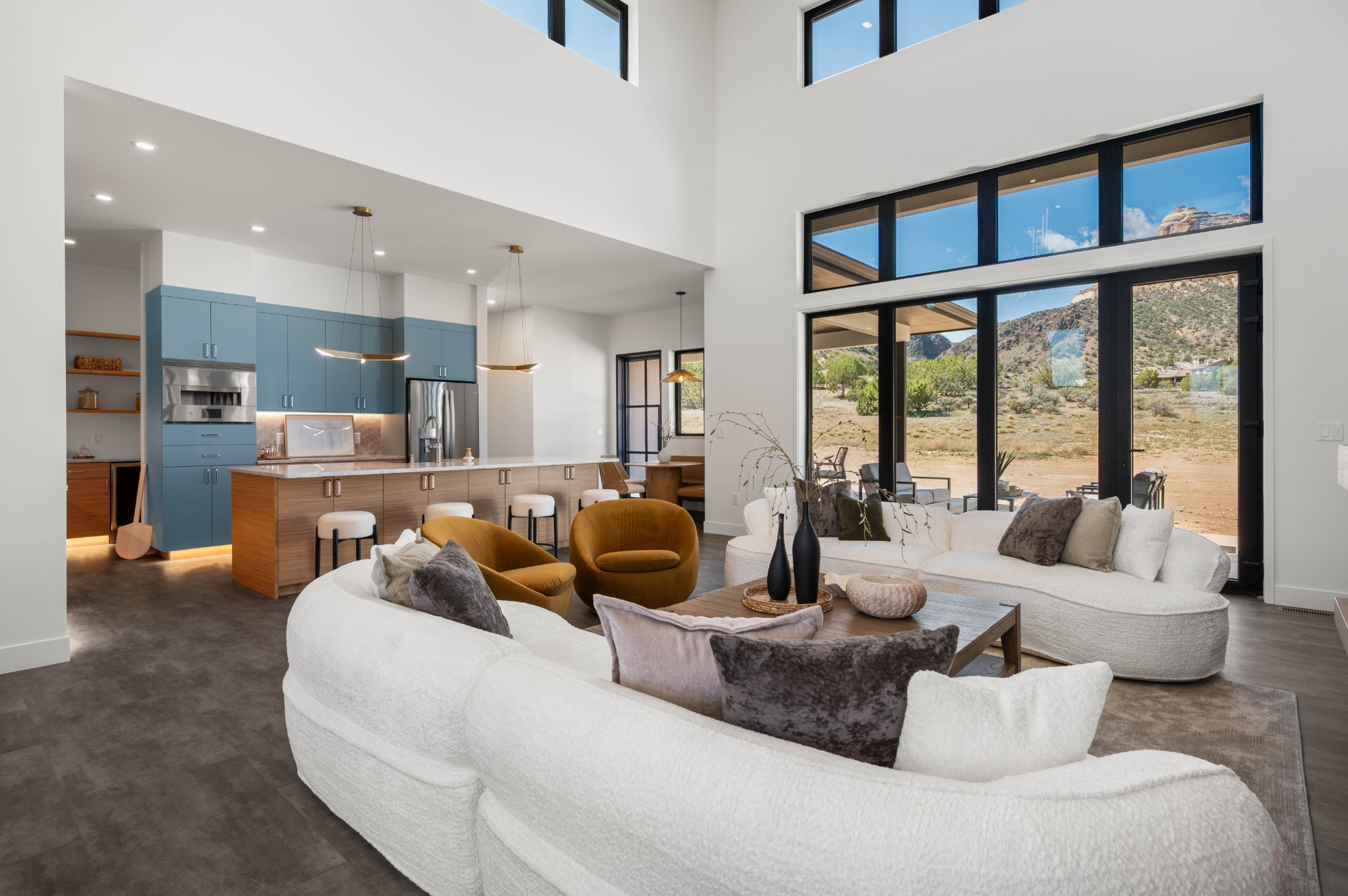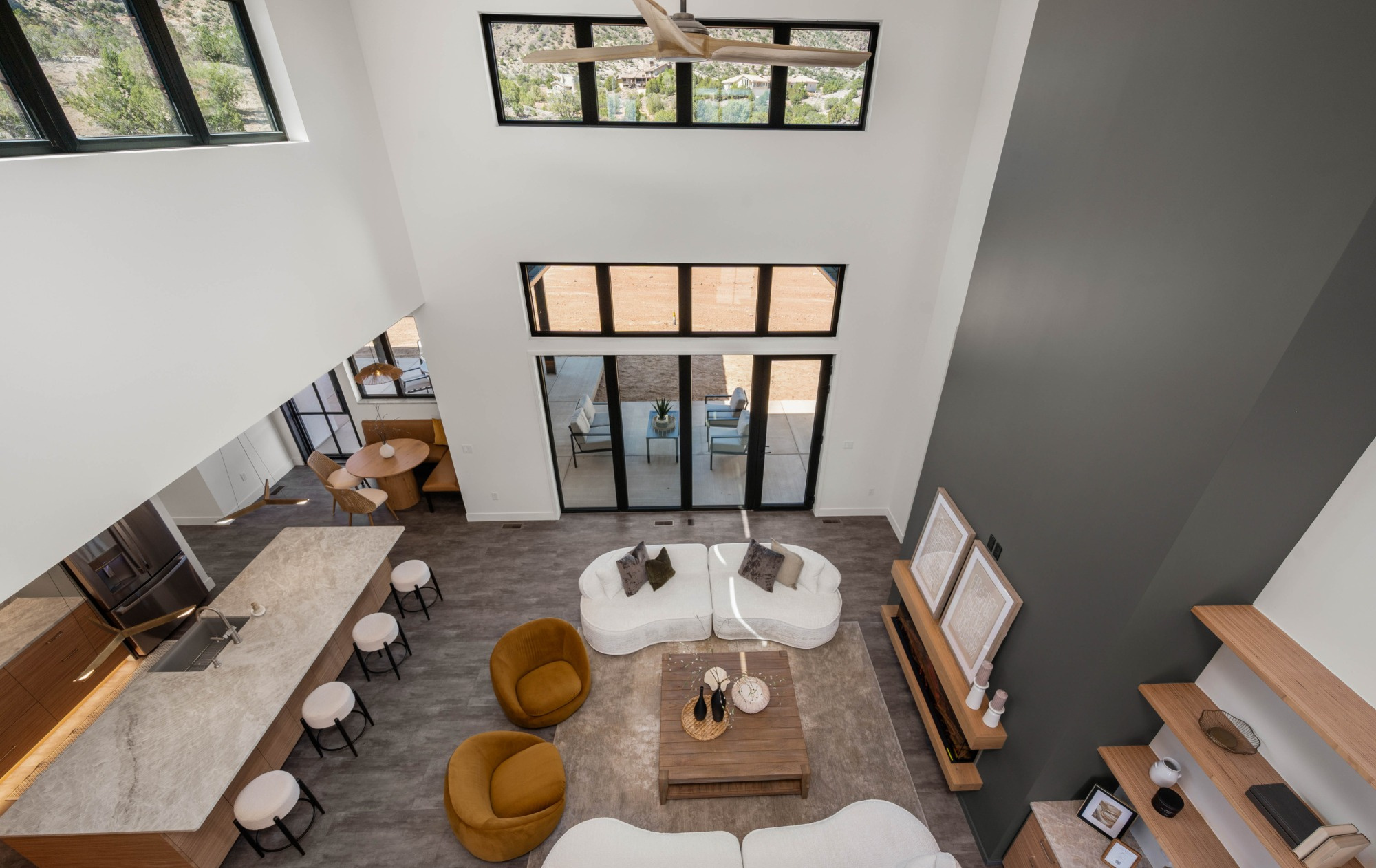 The 20-foot ceiling living room centers around the Orion Multi fireplace from Modern Flames, opening to a second floor reading loft. Enjoy your favorite beverage on the roof deck with views of the Bookcliffs and Grand Mesa.