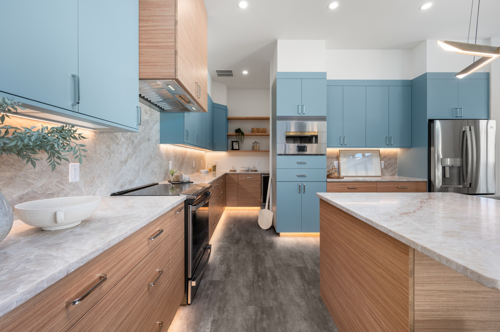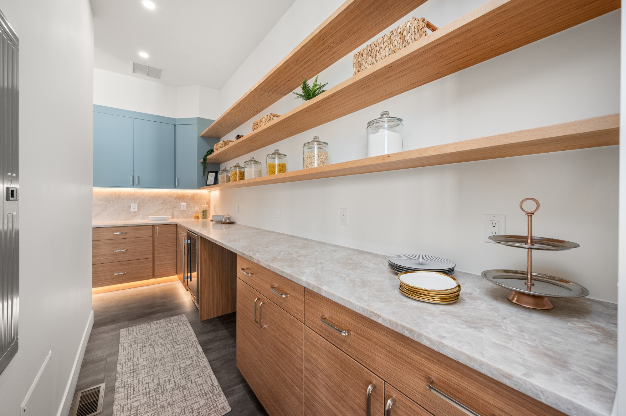 Material selections balance longevity with quiet luxury. Natural quartzite countertops — including Taj Mahal and Ocean Blue — anchor the kitchen and baths. The kitchen features two-tone cabinetry, GE Profile appliances, and a statement in-wall pizza oven from GE Monogram. A walk-through pantry includes a discreet “Costco door” for seamless unloading of groceries from garage.