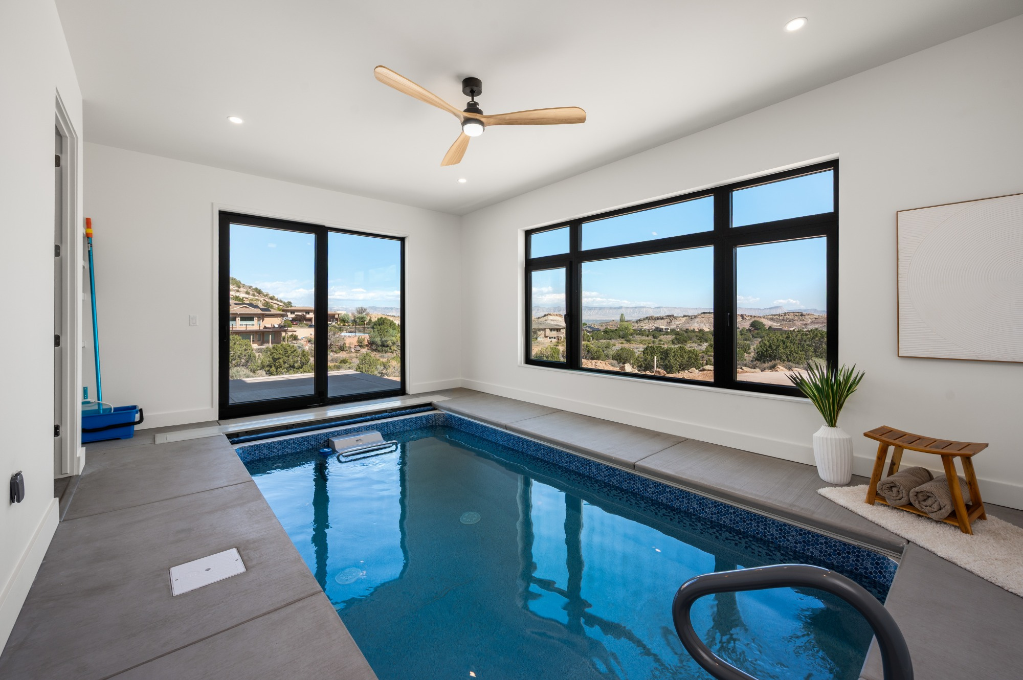 A dedicated pool room houses an 8x15 training pool with the Fastlane Pro current system from Endless Pools, insulated and engineered for efficiency, with a motorized safety cover and secondary drainage safeguards.
